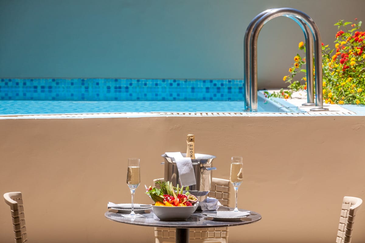 Salotto: Con un multi-angolo cottura completamente attrezzato, una sala da pranzo, ampio bagno in marmo con vasca, aria condizionata regolabile autonomamente, soggiorno con due divani letto, guardaroba e veranda con piscina privata di acqua dolce.