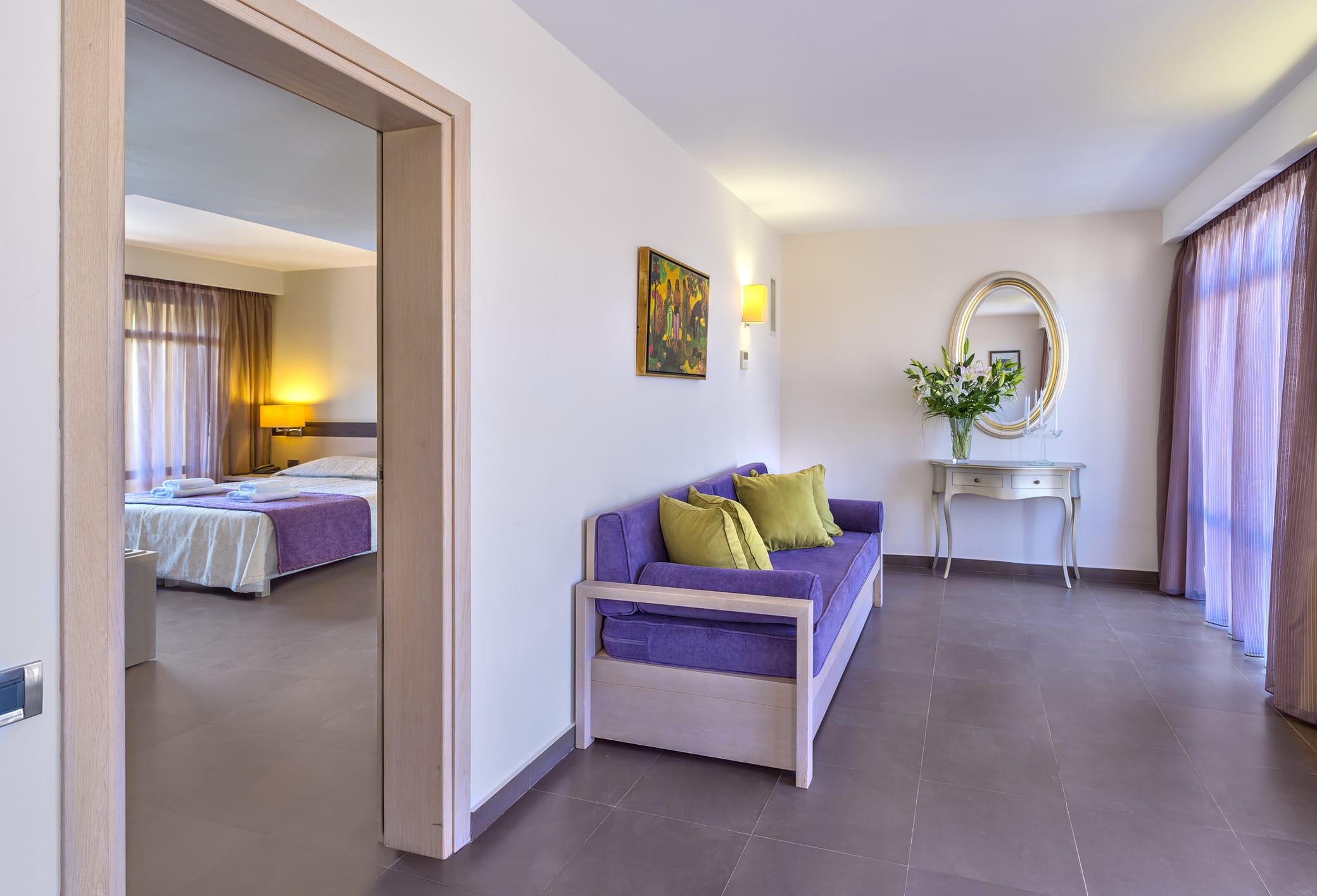 Una stanza su due livelli con scala, composta da un soggiorno con 2 divani letto (uno singolo e uno matrimoniale) al piano inferiore e una camera matrimoniale con due letti singoli al piano superiore. Dispongono di un ampio bagno in marmo con doccia e vasca separate e di un balcone.