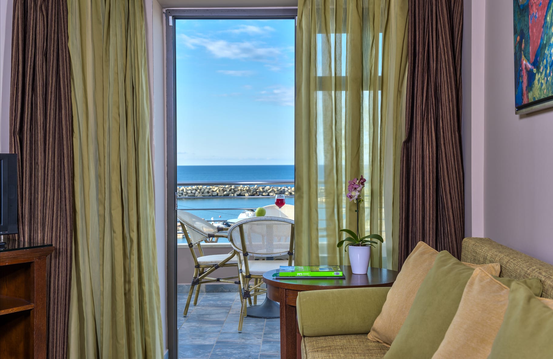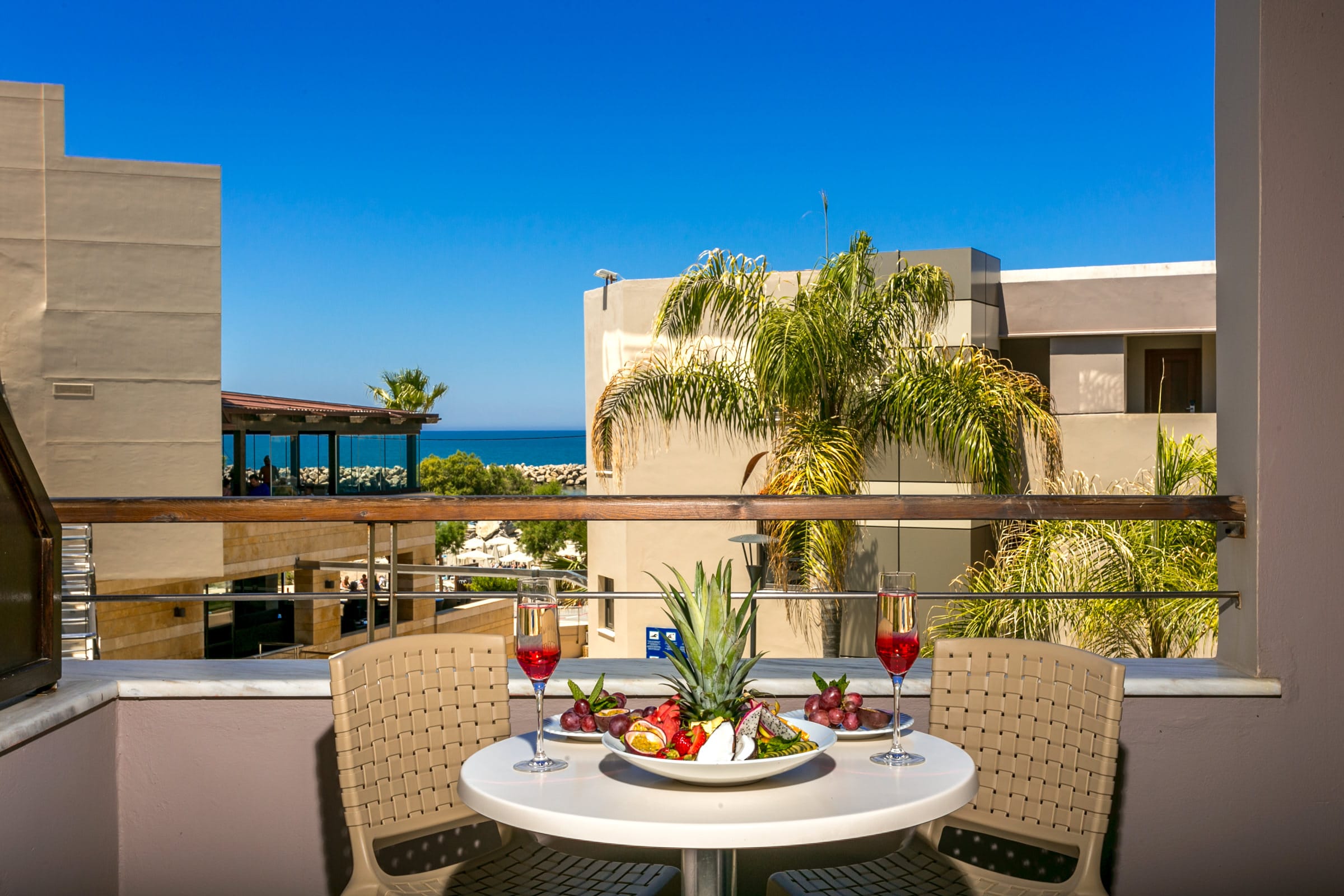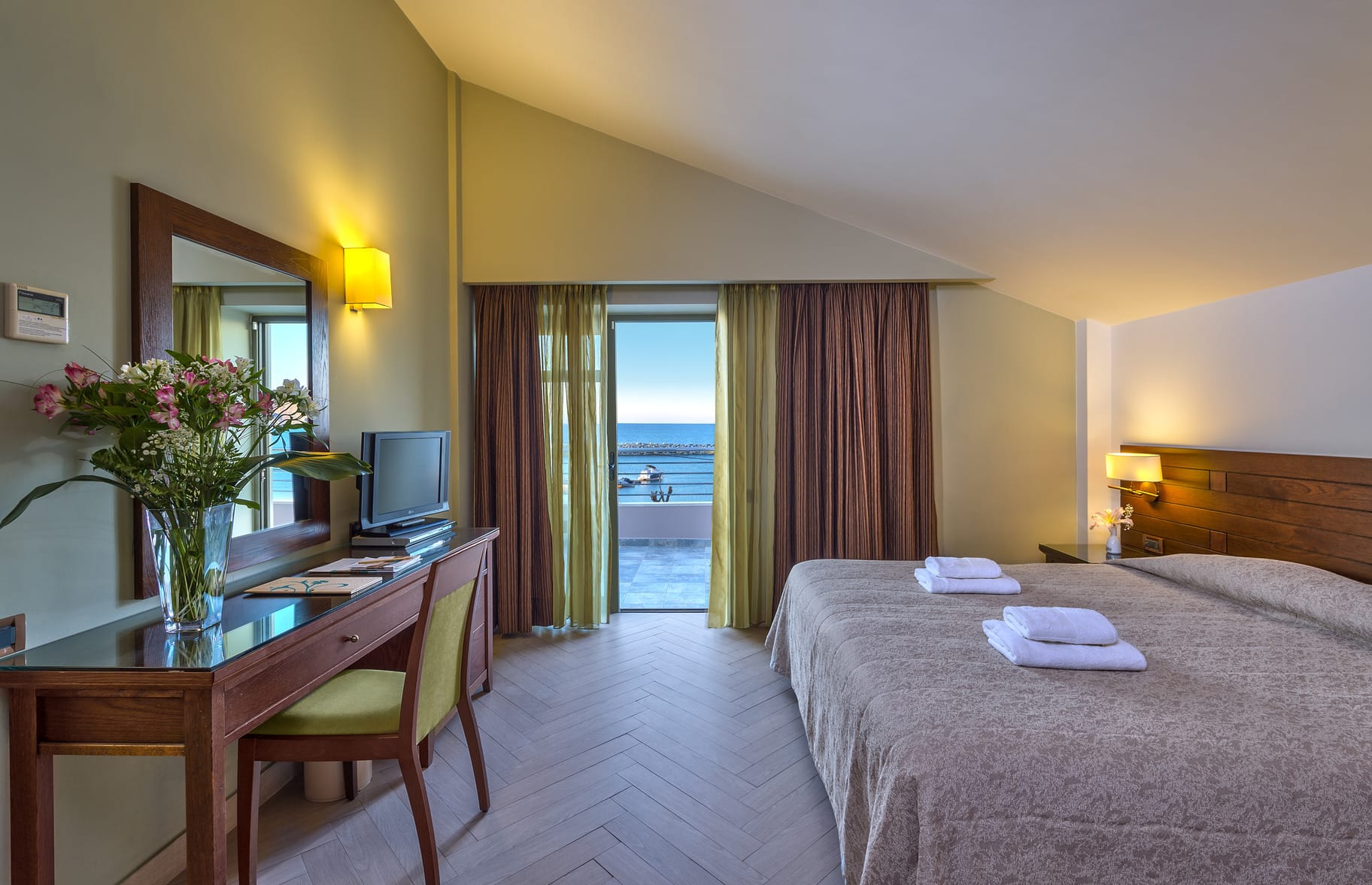 Un bagno in marmo con doccia, asciugacapelli, aria condizionata regolabile autonomamente (riscaldamento e raffreddamento), TV color satellitare, canali musicali, telefono diretto, accesso a Internet, piccolo frigorifero o minibar (su richiesta), cassetta di sicurezza, balcone con vista sul mare, sulla piscina o sul giardino.