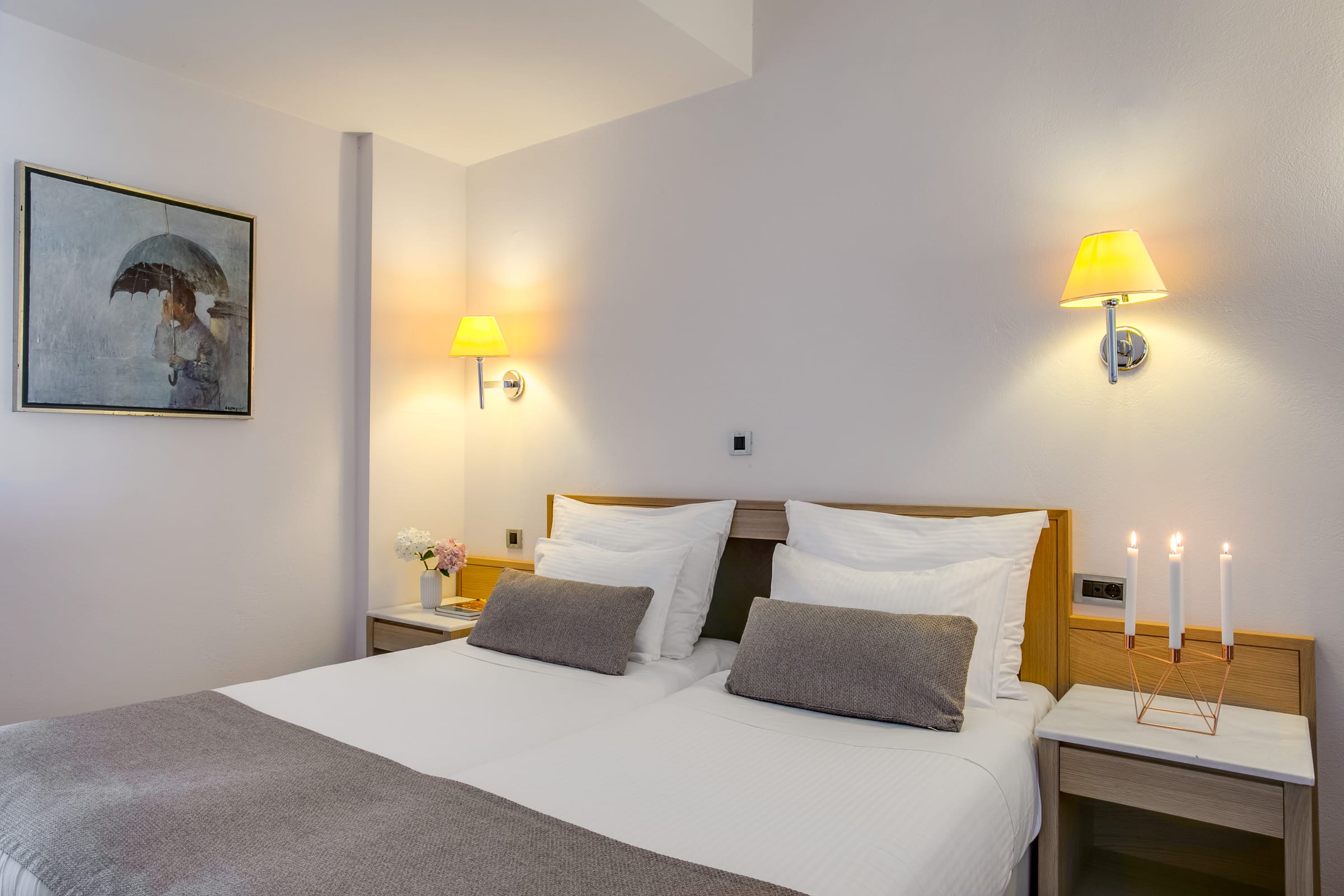 È composta da due letti singoli, o un letto matrimoniale, con un ampio bagno in marmo con vasca, asciugacapelli, aria condizionata regolabile autonomamente, TV color satellitare, canali musicali, telefono diretto, accesso a Internet (ISDN), minibar (disponibile su richiesta), cassetta di sicurezza e balcone o veranda.